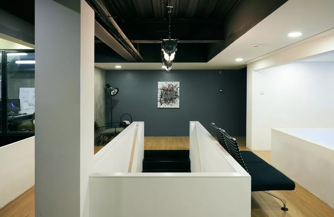 在空間的材質(zhì)使用上,主體采用黑白灰的配色,局部使用了黃銅質(zhì)感的金屬色,成為整體色調(diào)的亮點。公共區(qū)域的地面采用水泥自流平;辦公區(qū)和化妝間采用木地板;墻體保留原有磚墻肌理,表面清漆處理;而天花則用黑色噴涂裸頂,與攝影工作室的質(zhì)感格調(diào)相匹配。