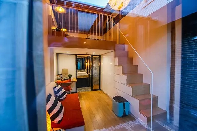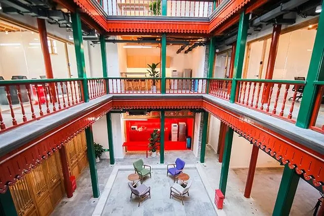 “共享際”是一座原理有點(diǎn)類似青年公寓的共享租房空間,圖為位于前門的打磨場共享際,每間住房為上下兩層的LOFT空間