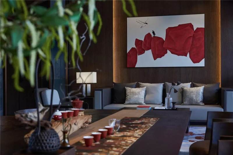 桌面借由點點紅綠添色,打破單調(diào),越發(fā)渲染生機(jī)與活力。兩端放置著極富水墨暈染狀的抽象畫作,以厚重的文化底蘊來響應(yīng)當(dāng)下的時空與場域。