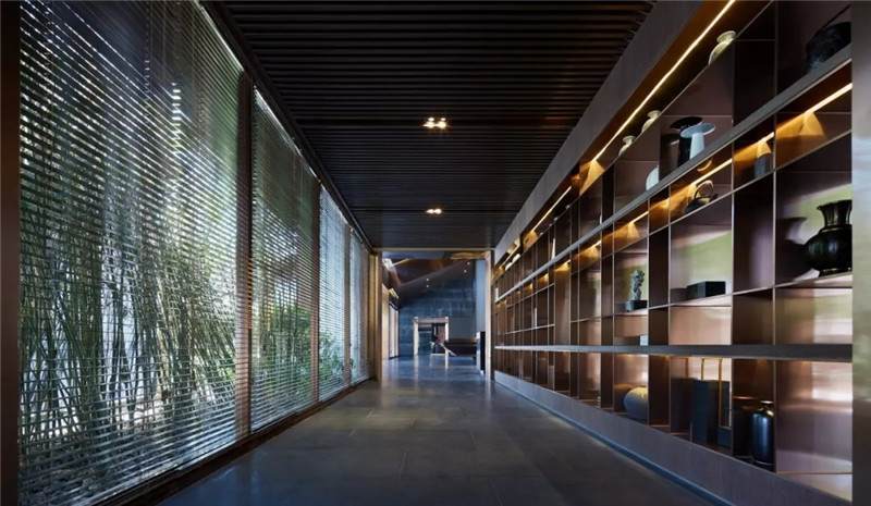大堂東側(cè),因勢利用通道設(shè)置藝術(shù)長廊,充沛的線條韻律,靈動的格架鏤空分割,虛實相生互補,氣場也在隨之巧妙切換。