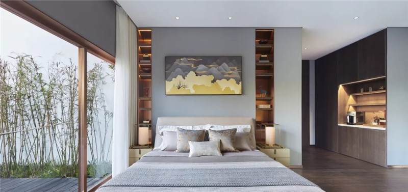 客房套間以現(xiàn)代簡約風(fēng)范融入自然,呈現(xiàn)安寧愜意之境。設(shè)計師賦予其三面環(huán)景的奢享體驗,實現(xiàn)室內(nèi)與自然的對話,物器與光影的互動。