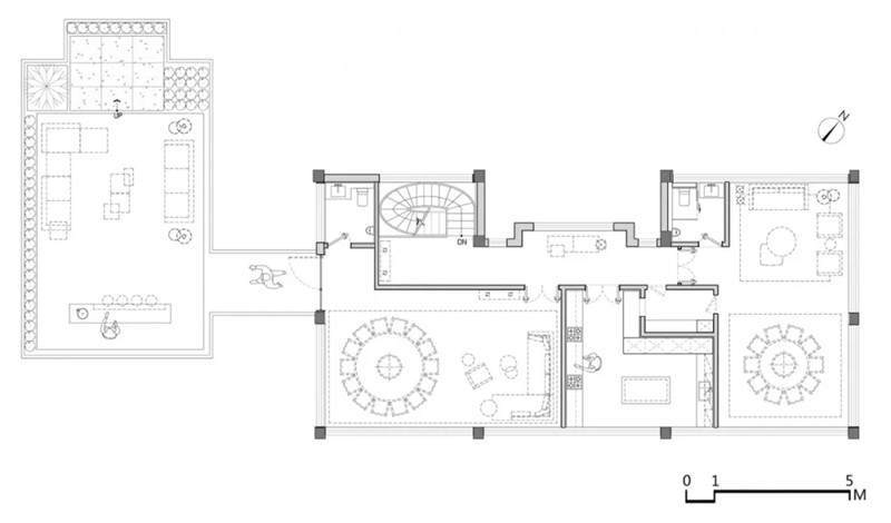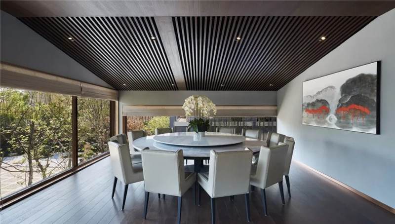二樓設(shè)有兩間獨立包廂,供賓客攜友享用。保留古建筑原有傾斜屋頂,尊重格局而做設(shè)計,大道至簡,方圓之間,各得其妙。借由通透的落地窗引入美好景致,讓視線變得有趣,用餐更為舒適、自然。