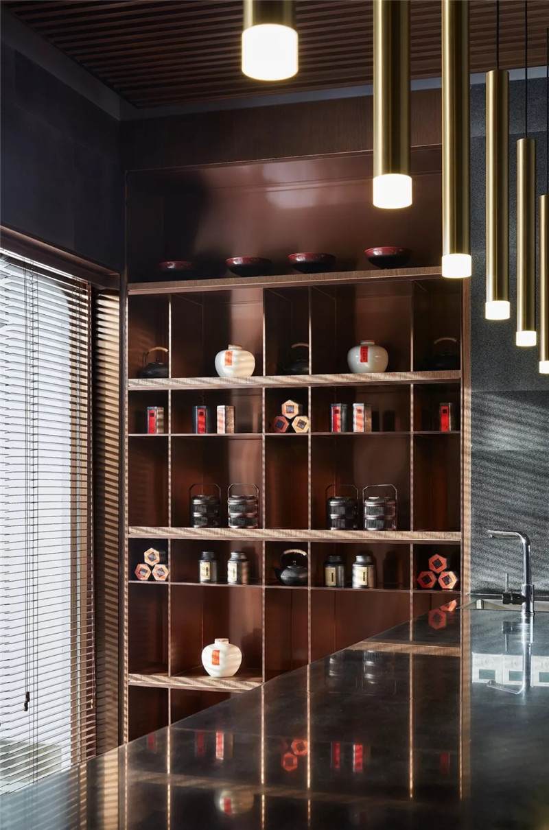 傳統(tǒng)古樸的根雕茶臺、日式絲織茶席,結(jié)合多樣材質(zhì)混搭,鋪展開一室古雅清愜。于此飲茶一甌,以裊裊升騰的水霧構(gòu)就品茗論道的精神棲居。水吧臺與茶室相對,茶文化展示架使用木格與金屬層板相交設(shè)置,以其跳躍性突破常規(guī)。
