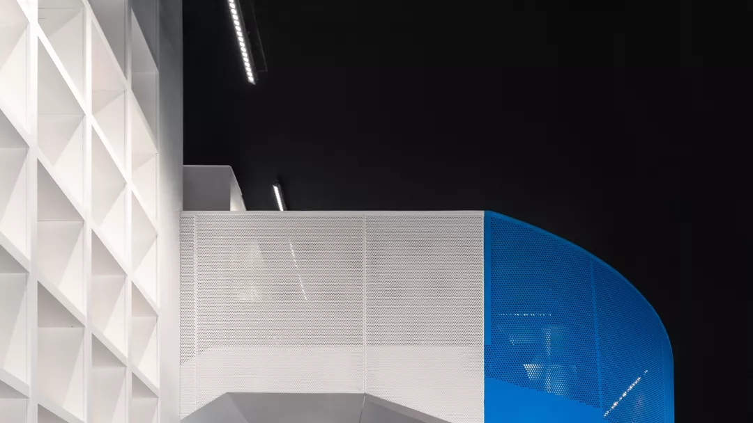 我用蒂芬妮藍閱讀屋作為女性盒子的中心,與此呼應的是入口可見的卡萊茵藍螺旋樓梯,以及盒子背面室外的明黃色兒童活動場地。他們精致地鑲嵌在有些迷離模糊的空間中成為點睛之筆。如果社區(qū)客廳藏在陳詞濫調(diào)的商業(yè)里面之后,就失去了示范作用。有空客廳的立面就是一個打開的盒子,高4米的半開門是穿孔鋁板制作的,形成了Wutopia Lab標志性的半透明界面。你能從這里隱隱約約的窺看到,溫暖的燈光,明亮的藍色,和孩子的笑聲。