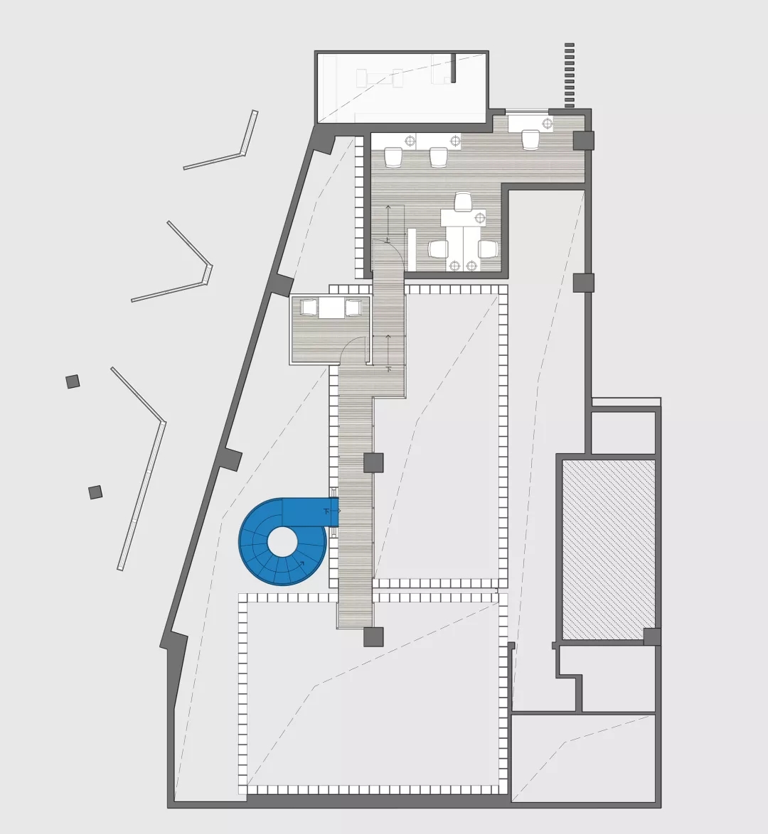 我們設計了一個夾層走廊隱藏在書架上.在課題研究中如何利用層高一直是房產(chǎn)商關心的,以我的實際經(jīng)驗,凈高2.1米仍然具有一定舒適度。在本案中,原本懸在社交盒子上的麻將房因為一樓層高過低無法成立,于是我們直接切斷,形成一個小陽臺作為暗示。