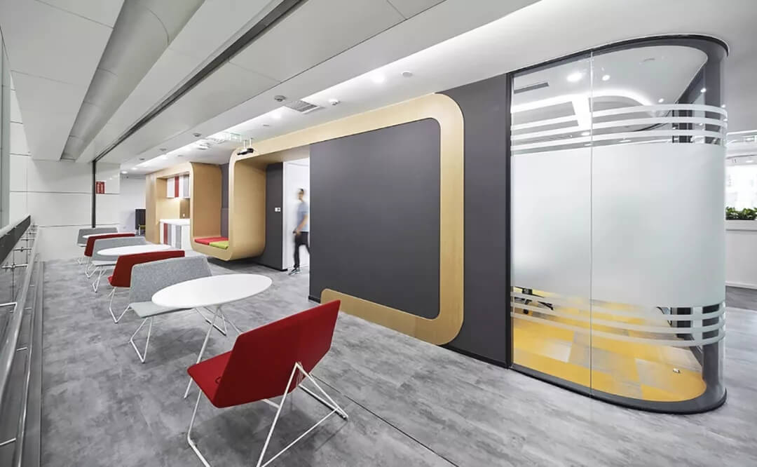 在軟裝設(shè)計(jì)上,該區(qū)域家具軟裝及墻壁,選擇明快的色調(diào),展示青春活力,并且用黑色烤漆玻璃內(nèi)嵌燈帶的方式營(yíng)造氛圍,透著數(shù)字化和科技感,表現(xiàn)商湯在數(shù)字時(shí)代的不同場(chǎng)景中,所呈現(xiàn)的多元化和創(chuàng)新性。