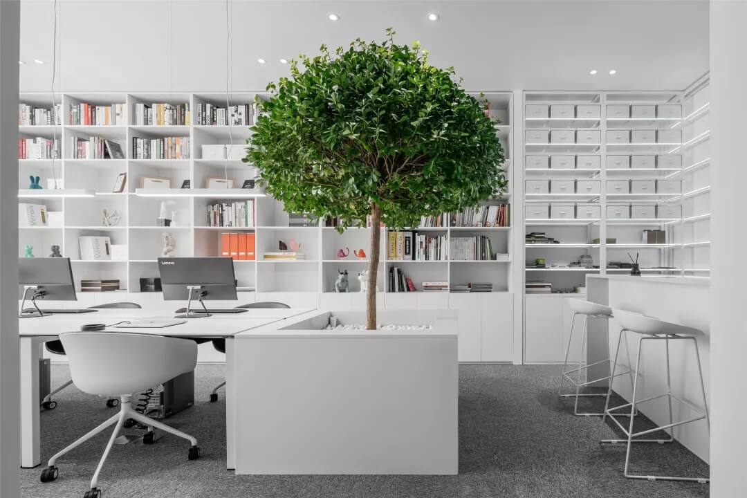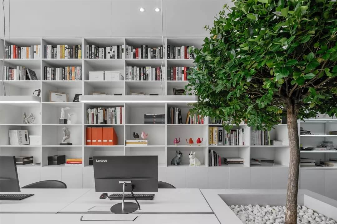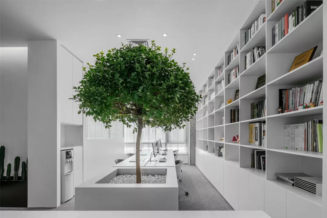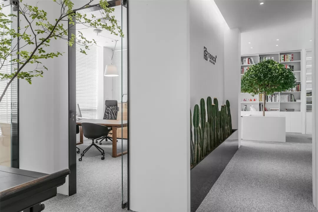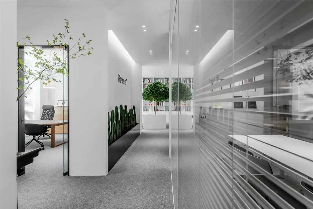 觸覺設計巧妙擷取文化于當代都會空間,展現(xiàn)出雅致韻味的同時留下了更多觸碰的余地。綠植來點亮辦公場所的鮮活生命力,清逸的色彩是思想游龍的軌跡,在留白的空間中伸出觸角,觸覺所及之處,思維綻放遐想。