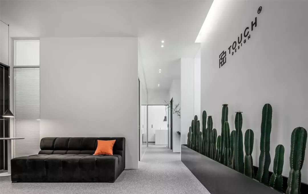 刪繁就簡,以最經(jīng)典的白色為主題搭配色調,沒有繁瑣的辦公室設計和過多的裝飾,減去辦公中的壓抑感。通過將自然純凈的白色與沉靜黑色相結合,將品牌形象簡潔地呈現(xiàn)表達,同時為左右空間的過渡創(chuàng)建和諧觀感。純白的墻面,接近心靈的澄凈;仙人掌是視覺的焦點,恣意生長、堅韌、夯實根基,也正寓意著公司的設計理念:有所依、有所仗、有所長。