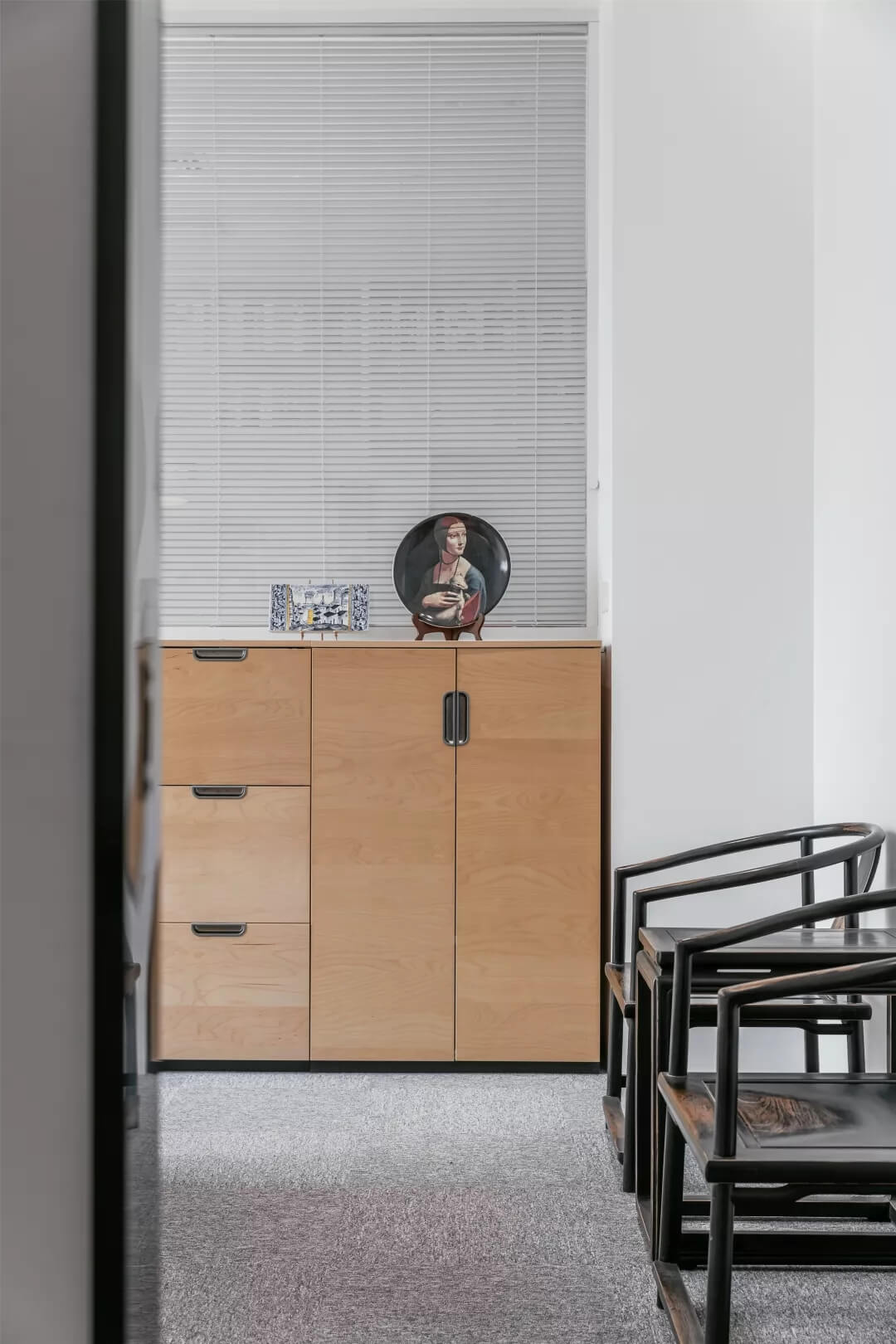 為了同時保證隱私和透明,張馳有道。會議室采用了玻璃+百葉窗的設計,這樣的交流區(qū)域保持彼此的通透與聯(lián)接,提升了場所的張力。使用貼合設計的局部掛畫藝術,配以金屬的深邃感官,多媒體影視裝置加強了墻面空間的信息輻射作用。