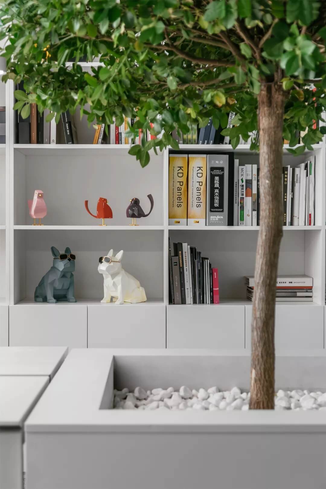 在這里,未知的一切與既有的常識記憶產(chǎn)生傳導,想象思維的觸角開始蔓延。小株綠樹分隔出挑高的白色高座式二人桌,提供了一種更為隨性、更利于面對面交流的辦公形式。