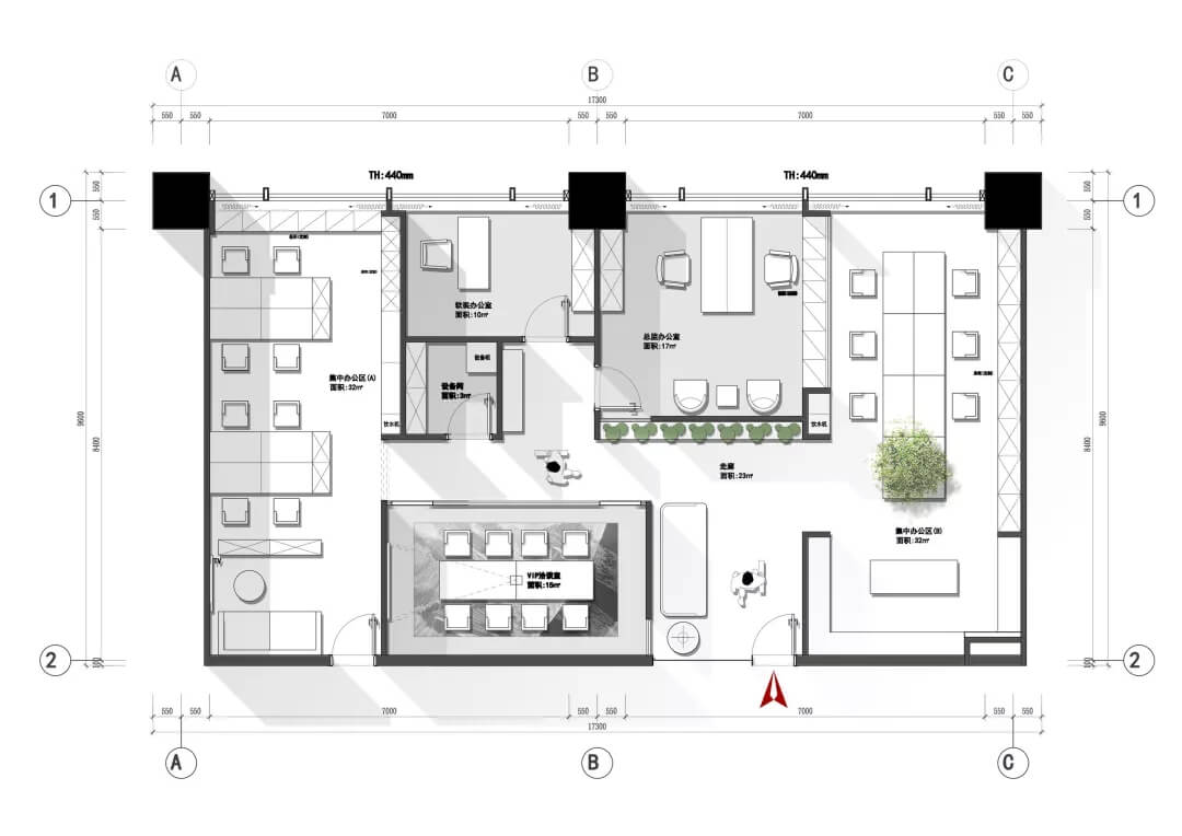 另一側的空間則增添了二三分私密性。沉穩(wěn)的木質案桌上,擺放的綠枝椏仿若思想的觸手,與仙人掌、小株綠植串聯(lián)起空間動線。區(qū)域內各自獨立,用玻璃門分隔開,在保證個人能最大限度沉浸思維創(chuàng)作的同時,又能及時地與伙伴交流互換,碰撞不同的思想。