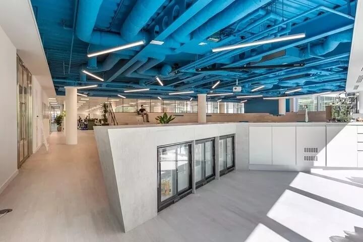本案最令人贊嘆的創(chuàng)意構(gòu)思是與接待區(qū)相連的休閑區(qū)的藍(lán)色頂面設(shè)計,藍(lán)色是公司的標(biāo)識色,除了這里也點綴于會議空間和靈動的工作區(qū)。裸露的頂面和設(shè)備管道都統(tǒng)一在純凈的藍(lán)色之中。這里不僅用于接待訪客同時也是大型集會、交流協(xié)作和派對活動之地。