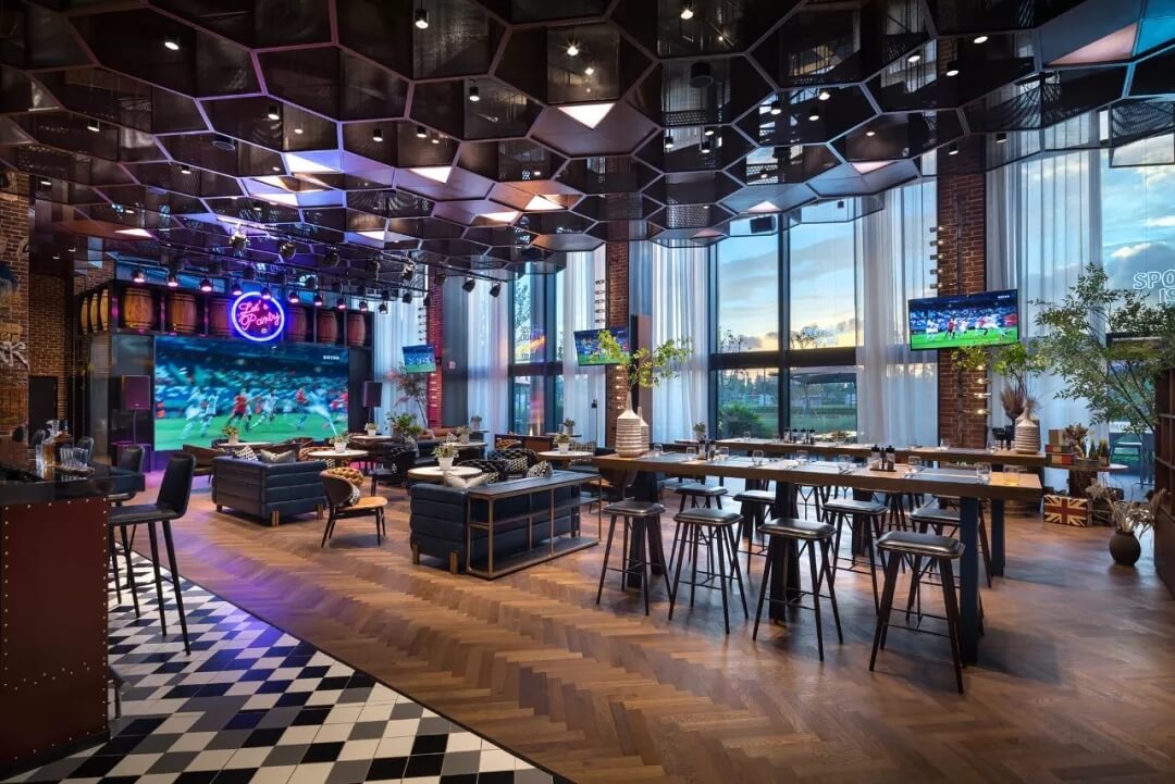 設(shè)計將足球的六邊形化用于天花的裝飾上,立體幾何的體量、金屬線條的質(zhì)感賦予了社交空間的適當(dāng)距離感。多幅大屏幕的配置,讓聚于此的人們,沉浸于啤酒吧和比賽現(xiàn)場的氛圍當(dāng)中,盡情享受在開闊大氣的空間格局中觀摩賽事的自由,為熱愛喝彩,為夢想干杯,傳遞運(yùn)動不止的精神。