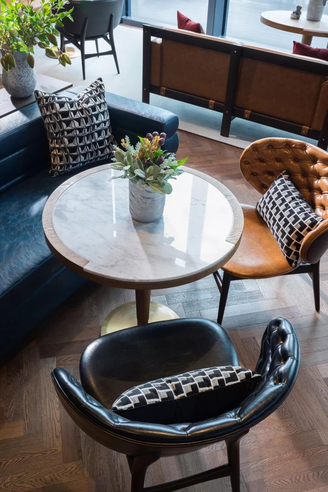 設(shè)計運(yùn)用極簡的語言,打開空間與自然的悄聲對話,咖色的皮質(zhì)沙發(fā)、幾處花藝、數(shù)個土陶裝飾,充盈著活力與生氣,人們置身此處,身心分外舒愜。