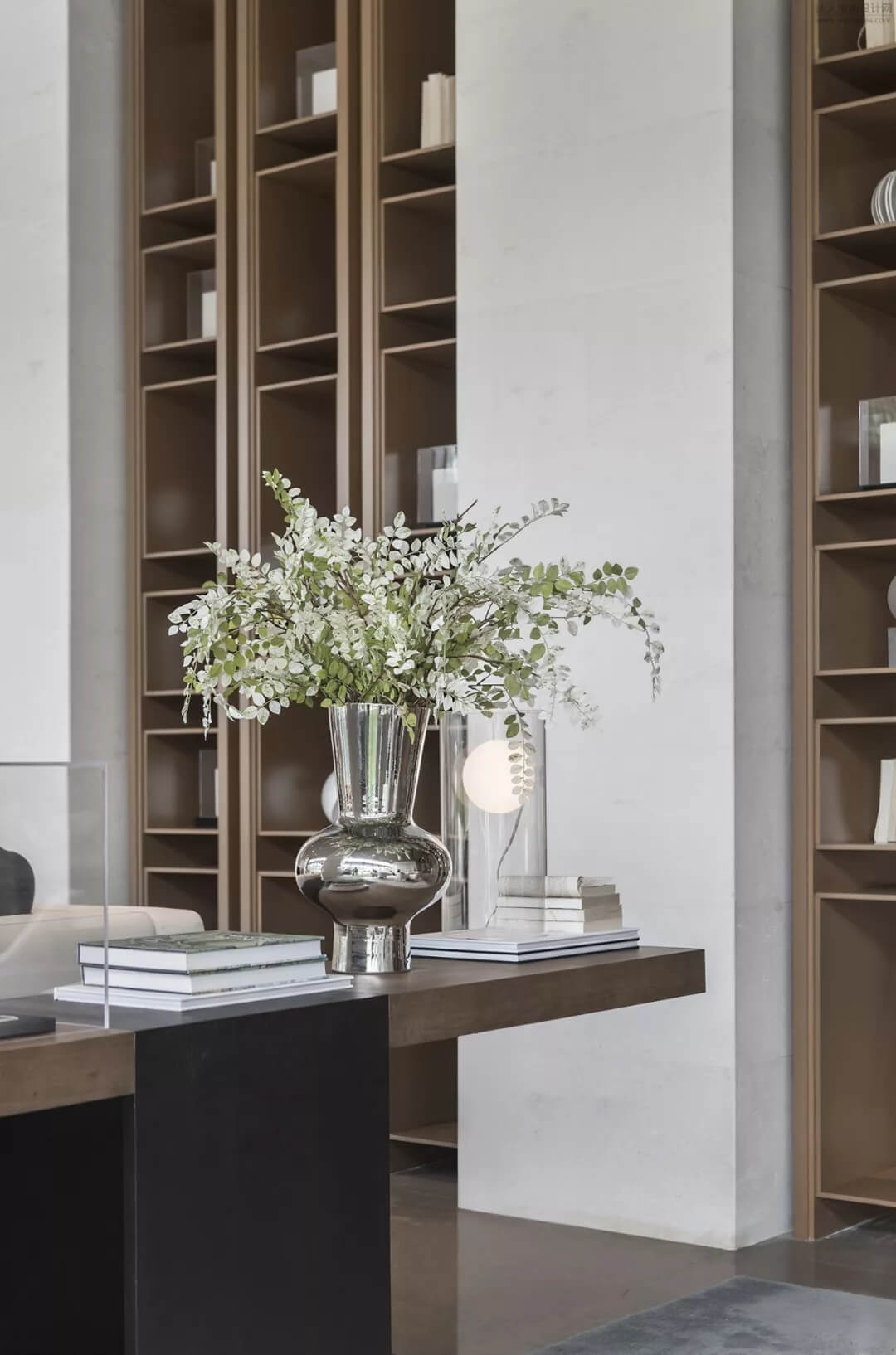 尊重木質的肌理美感,熟諳工藝,亞克力材質包裹的木質年輪,如同凍結了時間的流逝,守住這一刻的永恒。簡潔的質感綠色皮質沙發(fā)予以低調的奢華,同色系的植被增加了空間層次感。