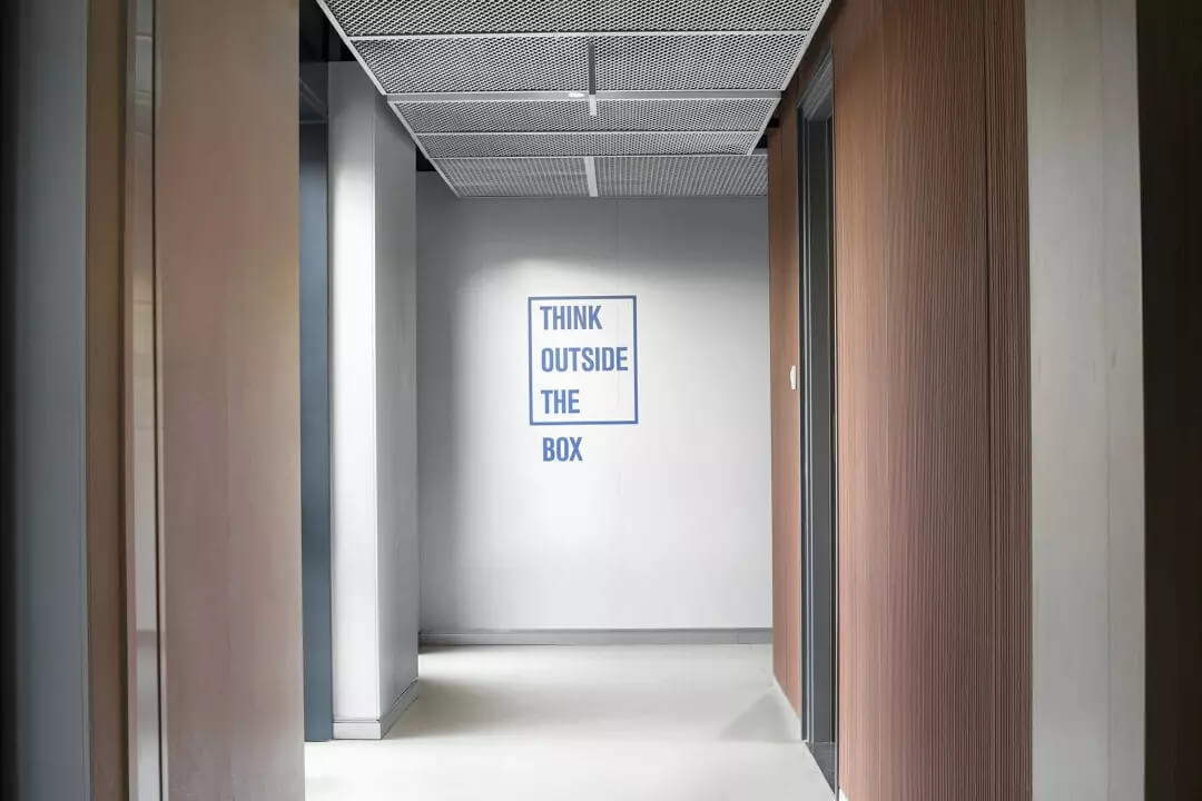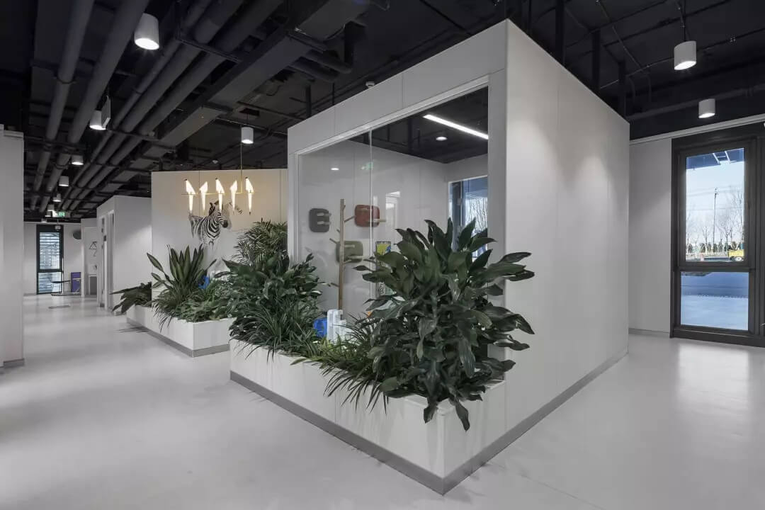 至于盒子以外的空間,我們想凝聚更多的人文藝術(shù)氣息,選擇較多地去鋪陳展示各種抽象的藝術(shù)線條和畫作,同時為了不失去生活氣息,各個角落選擇顏色比較跳躍的家居什物,讓它作為一個流動的戶外廣場,讓人可以自在穿行其中,偶爾停駐觀察,經(jīng)得住人聲鼎沸的喧擾,亦能提供心靈靜憩的安寧。在這里,大家認真辦公、生活、盡情交流、分享,它就是一個安放綠意,有極高包容度的公共空間。