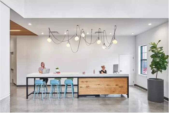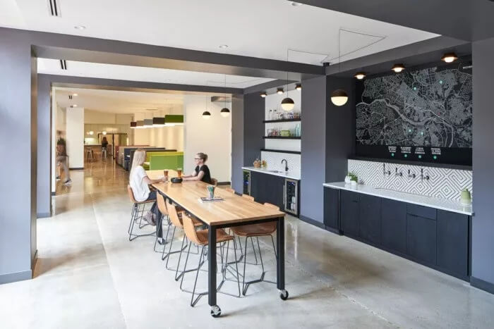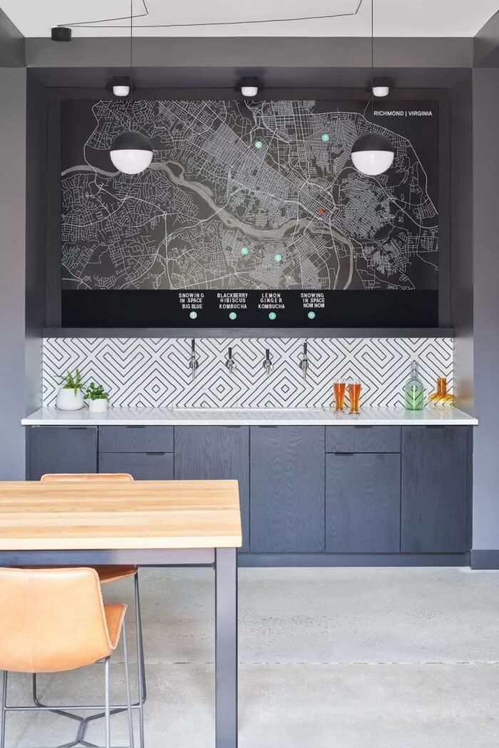 曾經(jīng)被濫用的中庭被重新構(gòu)想成該機(jī)構(gòu)的心臟-充滿活力的會(huì)議區(qū)和一間酒吧,設(shè)有來(lái)自里士滿地區(qū)的旋轉(zhuǎn)水龍頭。大堂取代了傳統(tǒng)的bun堡般的接待臺(tái)和獨(dú)立的休息區(qū),而是變成了一個(gè)畫(huà)廊—充滿活力,動(dòng)感十足,并嵌入了里士滿的性格。還有接待處?那個(gè)也被定制的鋼制桌子代替,該桌子可以兼作員工的共同工作空間。