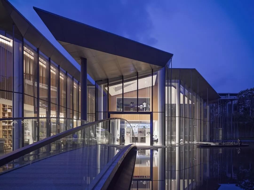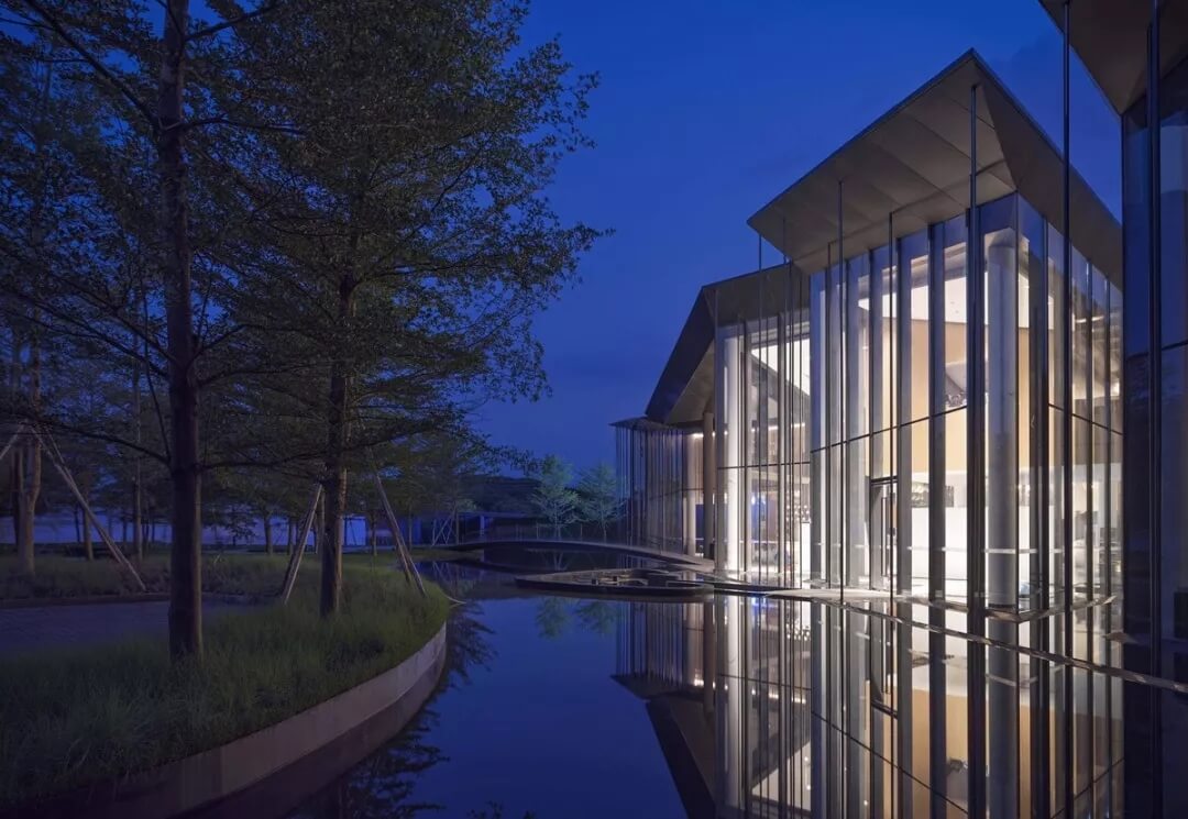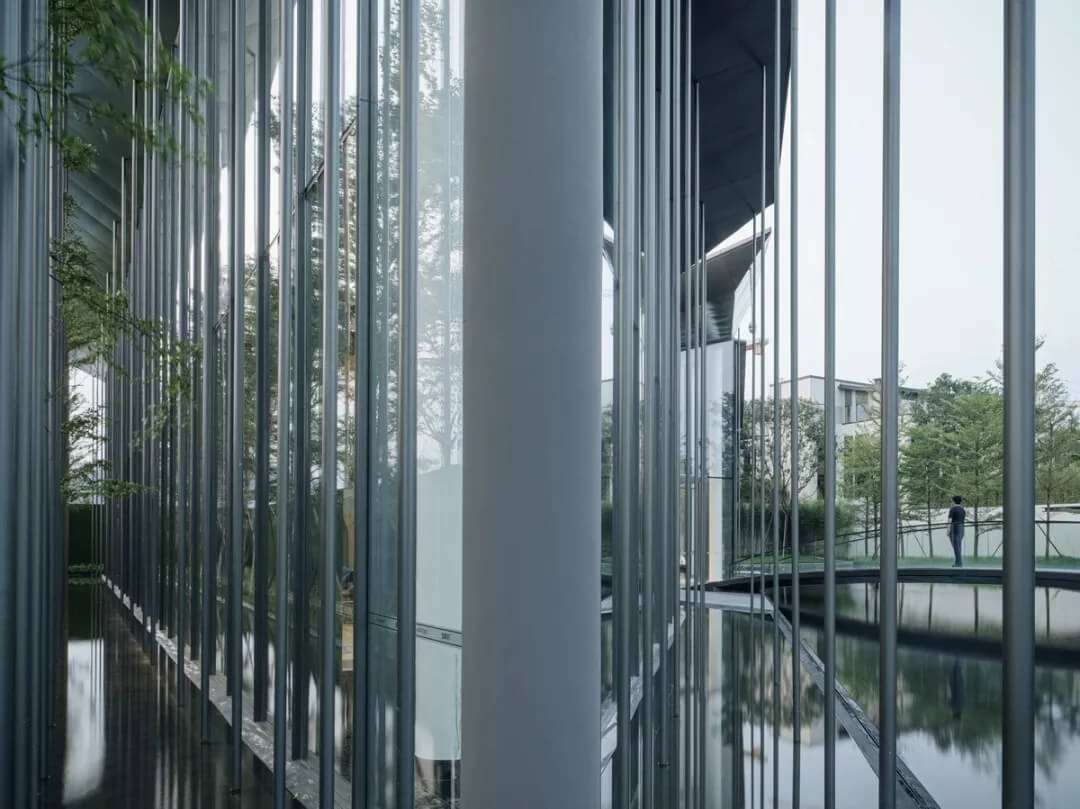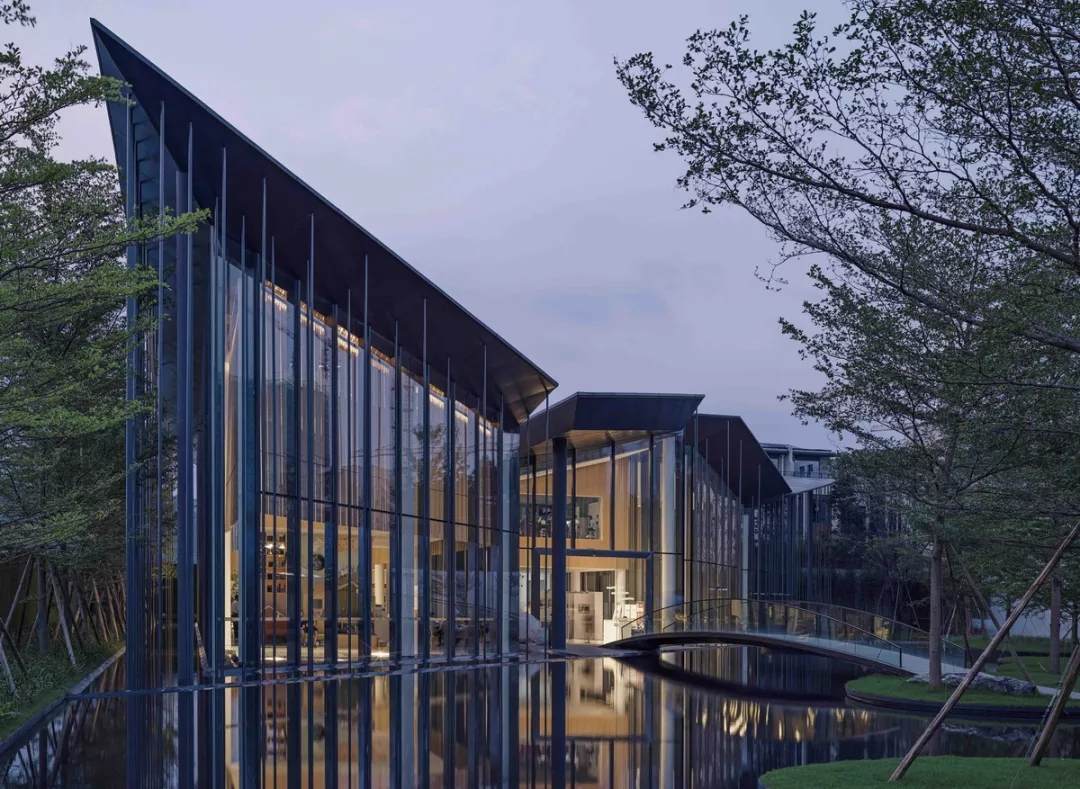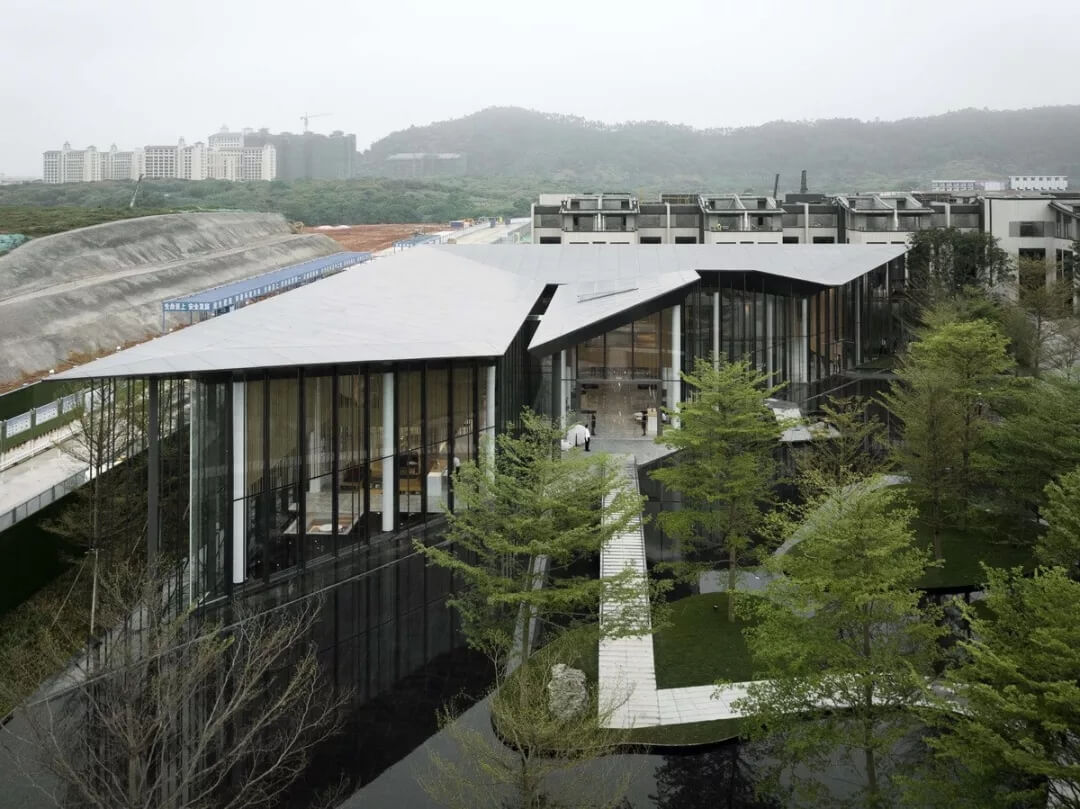 在這個(gè)項(xiàng)目中,建筑師嘗試用現(xiàn)代的理念、結(jié)構(gòu)和材料來(lái)打造由封閉走向開放融合的客家建筑,創(chuàng)造出傳統(tǒng)文化和現(xiàn)代觀念相結(jié)合的建筑形態(tài)。如同客家建筑大多坐落于山水樹林間,這座雙層建筑與周圍自然景觀也保持著親密聯(lián)系。剪影式的三角形頂棚如同山的影子般遮蓋著地面;而支撐著整個(gè)三角屋頂?shù)慕饘僦韧鹑裘艿臉淞?,與戶外的樹木連成一片;環(huán)繞場(chǎng)地的水景弱化了由剛性的幾何平面帶來(lái)的疏離感,大面積的玻璃的應(yīng)用,引入周圍綠色景觀,重新定義了建筑與周邊的環(huán)境關(guān)系。莊重但不厚重的頂棚,高聳錯(cuò)落的柱廊,通透的落地玻璃,山與樹與水。
