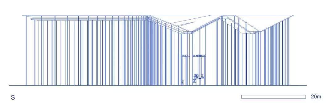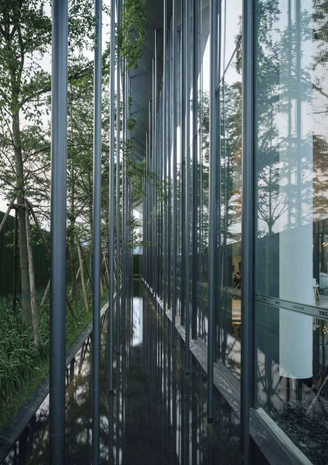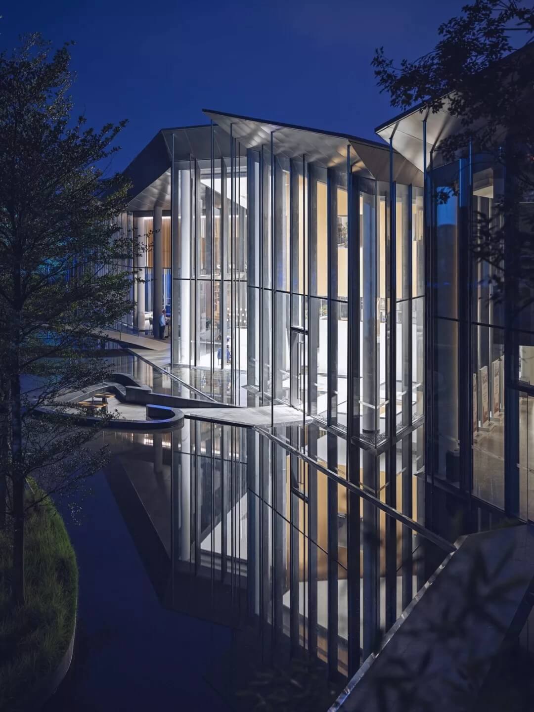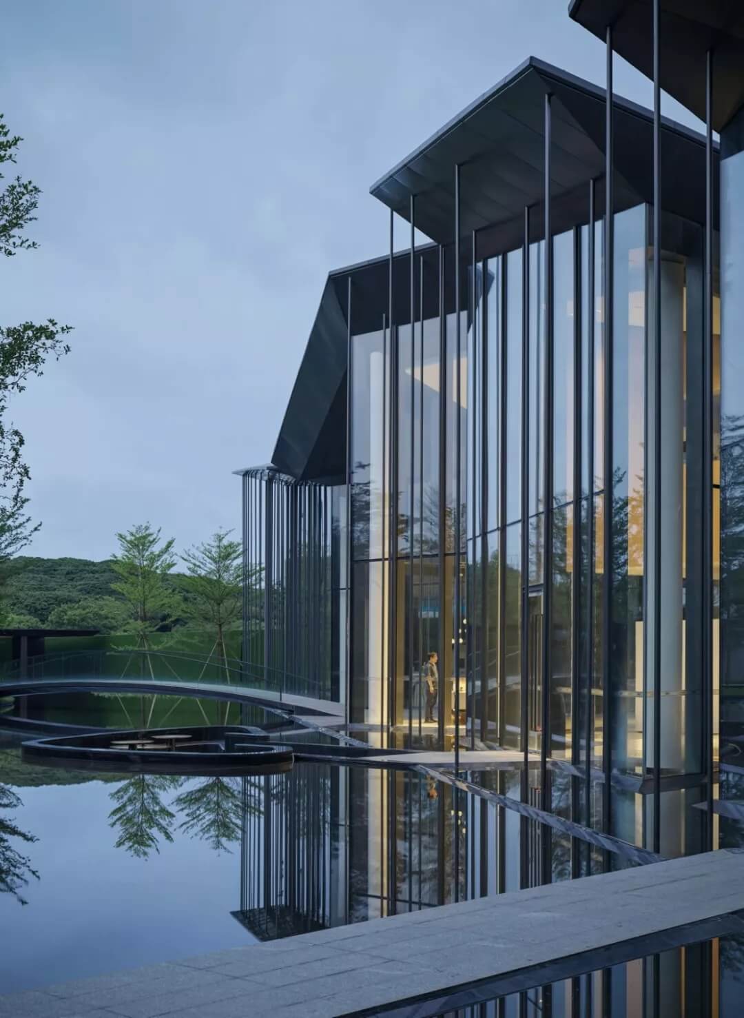 在這個(gè)項(xiàng)目中,建筑師嘗試用現(xiàn)代的理念、結(jié)構(gòu)和材料來(lái)打造由封閉走向開放融合的客家建筑,創(chuàng)造出傳統(tǒng)文化和現(xiàn)代觀念相結(jié)合的建筑形態(tài)。如同客家建筑大多坐落于山水樹林間,這座雙層建筑與周圍自然景觀也保持著親密聯(lián)系。剪影式的三角形頂棚如同山的影子般遮蓋著地面;而支撐著整個(gè)三角屋頂?shù)慕饘僦韧鹑裘艿臉淞?,與戶外的樹木連成一片;環(huán)繞場(chǎng)地的水景弱化了由剛性的幾何平面帶來(lái)的疏離感,大面積的玻璃的應(yīng)用,引入周圍綠色景觀,重新定義了建筑與周邊的環(huán)境關(guān)系。莊重但不厚重的頂棚,高聳錯(cuò)落的柱廊,通透的落地玻璃,山與樹與水。