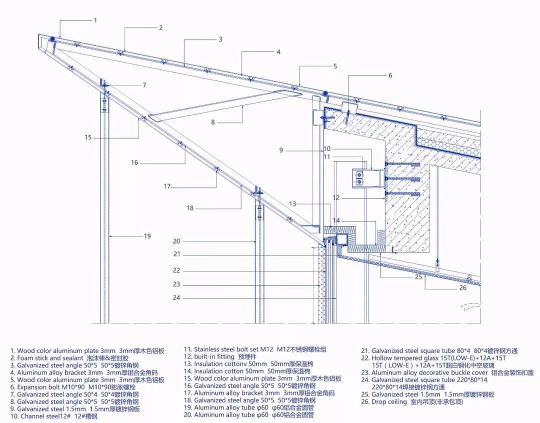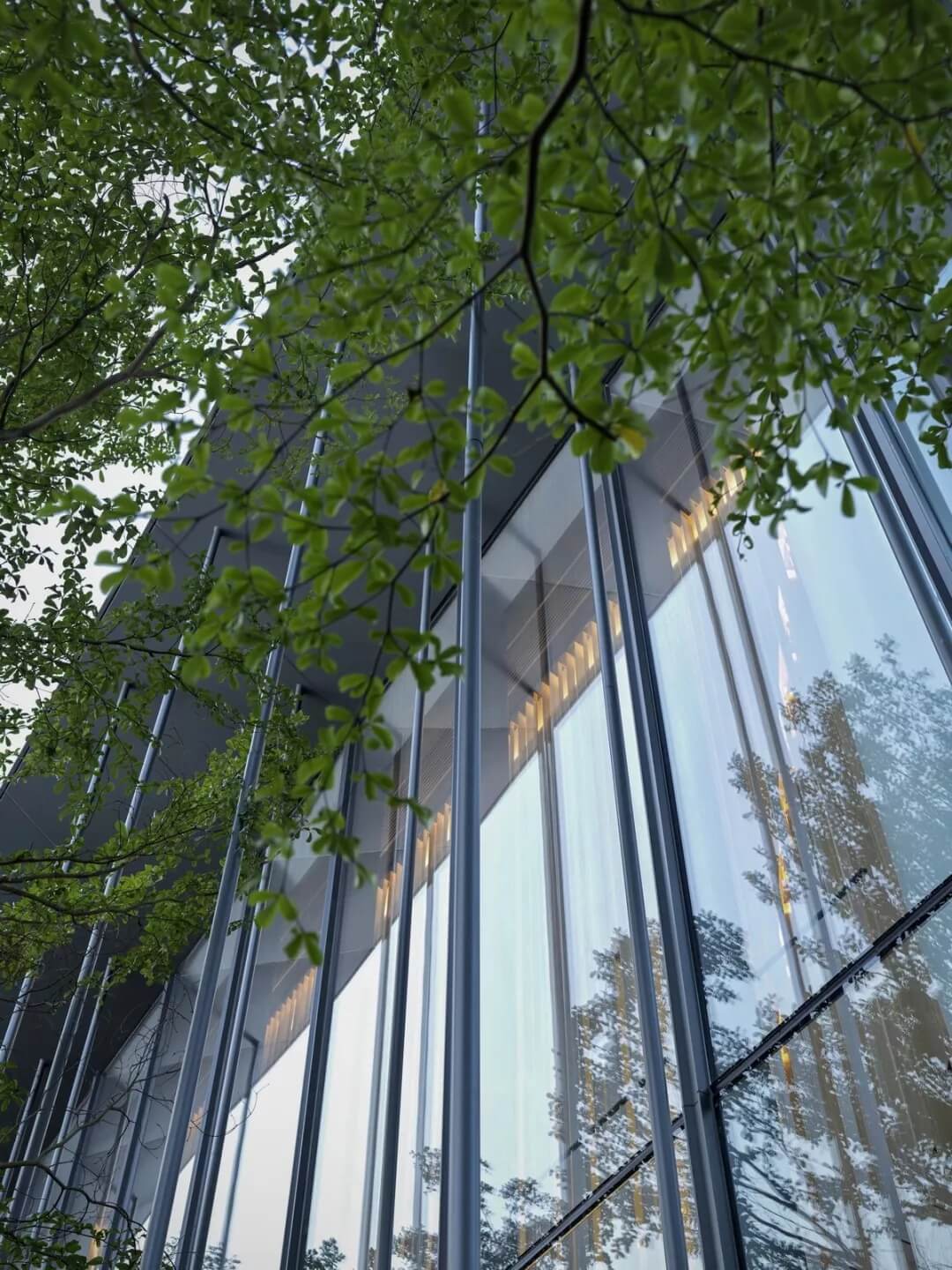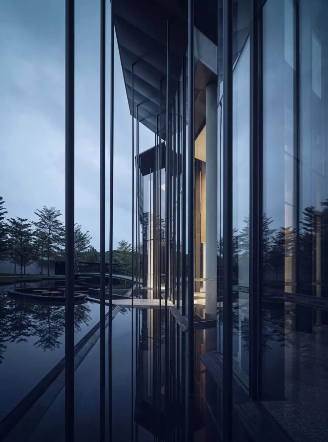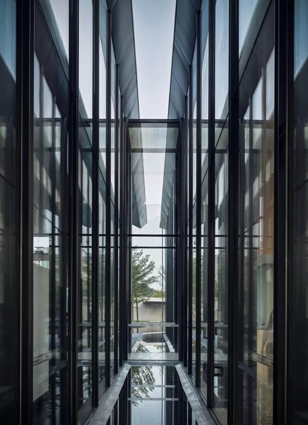 在這個(gè)項(xiàng)目中,建筑師嘗試用現(xiàn)代的理念、結(jié)構(gòu)和材料來(lái)打造由封閉走向開放融合的客家建筑,創(chuàng)造出傳統(tǒng)文化和現(xiàn)代觀念相結(jié)合的建筑形態(tài)。如同客家建筑大多坐落于山水樹林間,這座雙層建筑與周圍自然景觀也保持著親密聯(lián)系。剪影式的三角形頂棚如同山的影子般遮蓋著地面;而支撐著整個(gè)三角屋頂?shù)慕饘僦韧鹑裘艿臉淞?,與戶外的樹木連成一片;環(huán)繞場(chǎng)地的水景弱化了由剛性的幾何平面帶來(lái)的疏離感,大面積的玻璃的應(yīng)用,引入周圍綠色景觀,重新定義了建筑與周邊的環(huán)境關(guān)系。莊重但不厚重的頂棚,高聳錯(cuò)落的柱廊,通透的落地玻璃,山與樹與水。