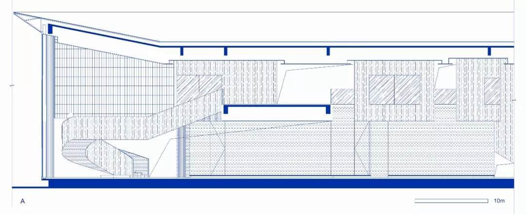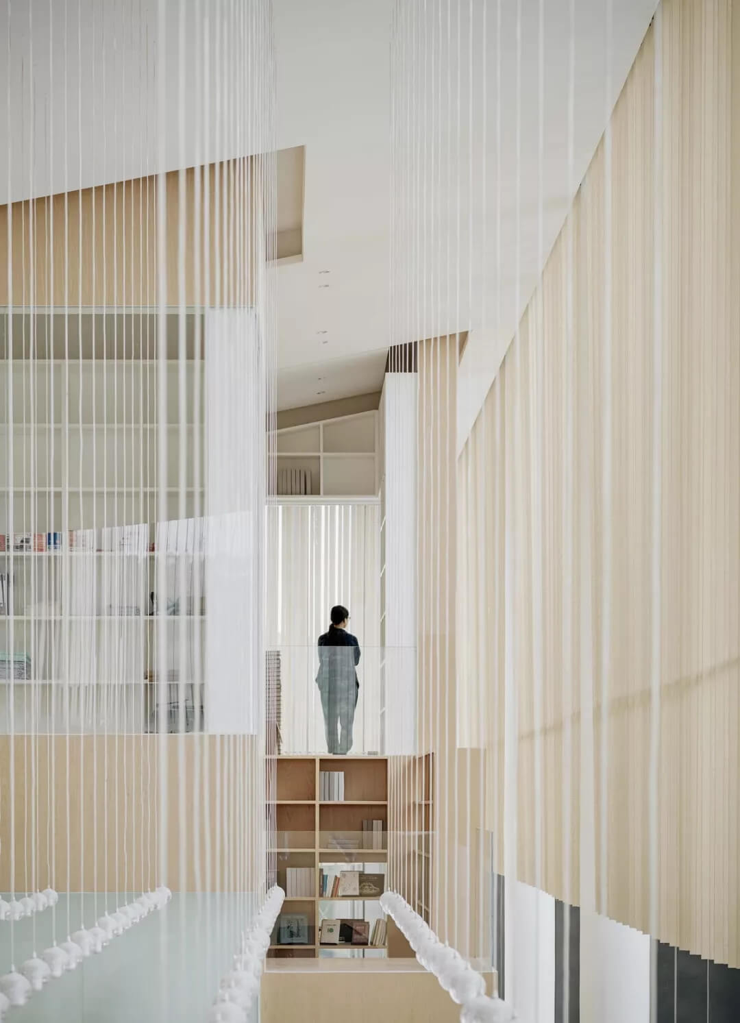 為了適應(yīng)當(dāng)?shù)貧夂?,建筑師在南翼雙層通高的開敞空間內(nèi)設(shè)置了懸垂的木隔柵,可以達(dá)到舒適的遮陽(yáng)效果,并且具有空間劃分的功能。公共洽談區(qū),雙層書架,咖啡吧就位于此。平行垂落且錯(cuò)落的木隔柵打破了安靜的空間氛圍,和室外的廊柱相互呼應(yīng)的同時(shí),密布的木隔柵也自身形成體量與二層的功能體塊虛實(shí)相生。