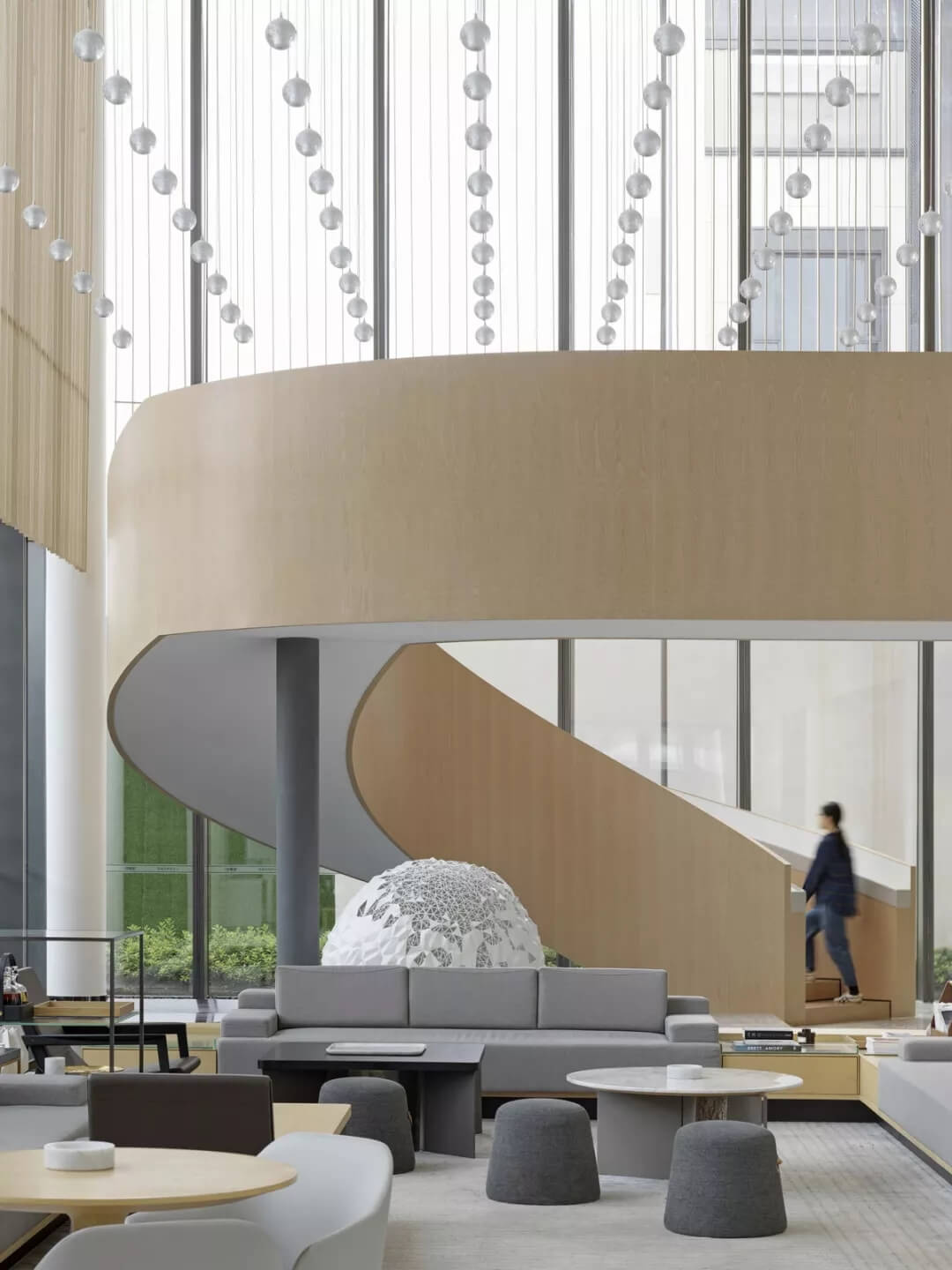 主要的休閑洽談區(qū)域通過(guò)強(qiáng)調(diào)垂直上的縱深感和透明度,營(yíng)造出一種平穩(wěn)而開放的空間氛圍。與洽談區(qū)相鄰的咖啡吧坐落于一個(gè)巨大的木質(zhì)書架旁,書架隨著木飾樓梯一直延伸至二層,繼而連接起相對(duì)僻靜私密的閱讀空間。