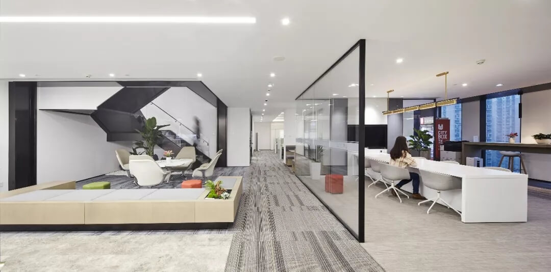 步梯采用極簡折轉(zhuǎn)的造型和玻璃材質(zhì),每層的樓梯區(qū)結(jié)合景觀設(shè)計(jì),聯(lián)通電梯入口,茶水間,設(shè)置景觀小品,圖書閱讀空間,洽談卡座,等候區(qū)等,形成辦公空間的共享交流區(qū)和創(chuàng)意生活區(qū),打造有活力,展示性強(qiáng)的員工休閑活動區(qū)。