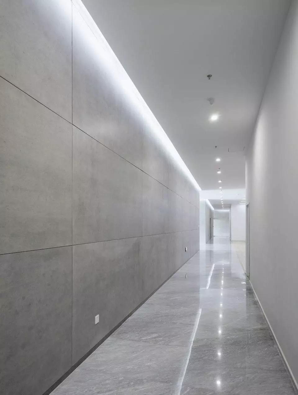不同的空間內(nèi)容對(duì)應(yīng)不同的材質(zhì)氛圍,從色彩到質(zhì)感,再到意象化的裝飾,我們依據(jù)大堂、會(huì)議、休息室、中庭等不同空間尺度與空間內(nèi)容營造新穎豐富、恰如其分的空間氛圍。溫暖的木色、混凝土板、白色大理石和白色乳膠漆為主要材料,其中報(bào)告廳大異其趣,優(yōu)雅高貴的深灰色布藝軟包與報(bào)告廳的相對(duì)集中和封閉性相得益彰。我們依托原有建筑空間序列,如大堂-電梯廳-等候區(qū)-多功能廳-VIP室-展廳,調(diào)整改變室內(nèi)設(shè)計(jì)的溫度與濃度,為原本純功能理性化的空間組織蒙上一層魅力面紗,讓功能化的“經(jīng)過”變?yōu)橐淮尾簧岬鸟v留與感受。