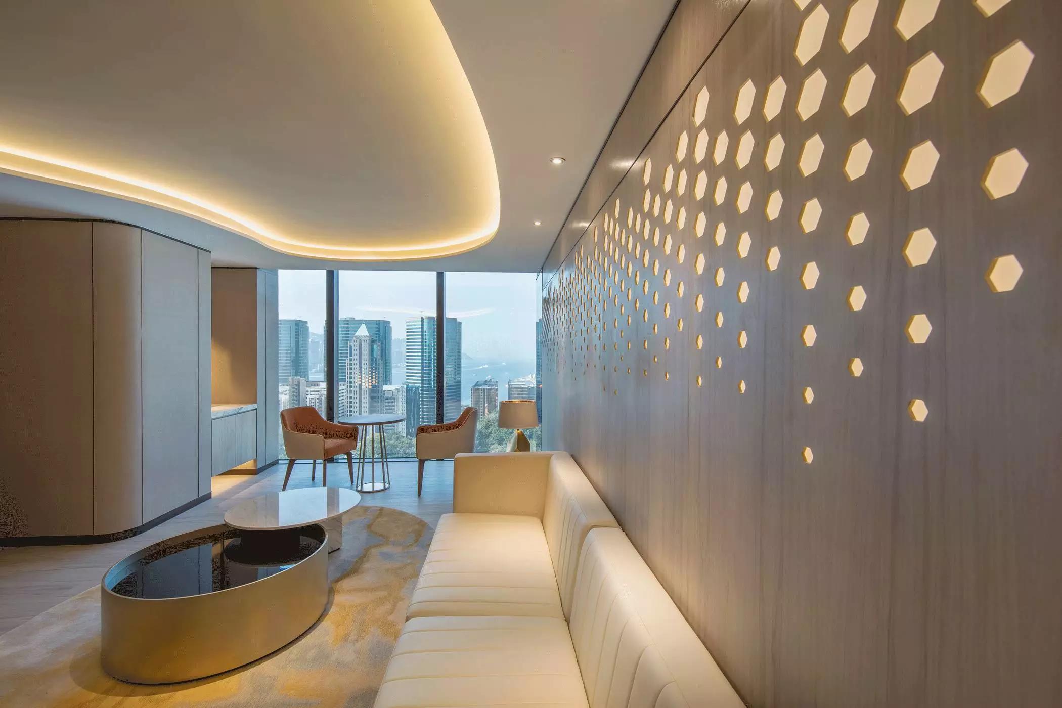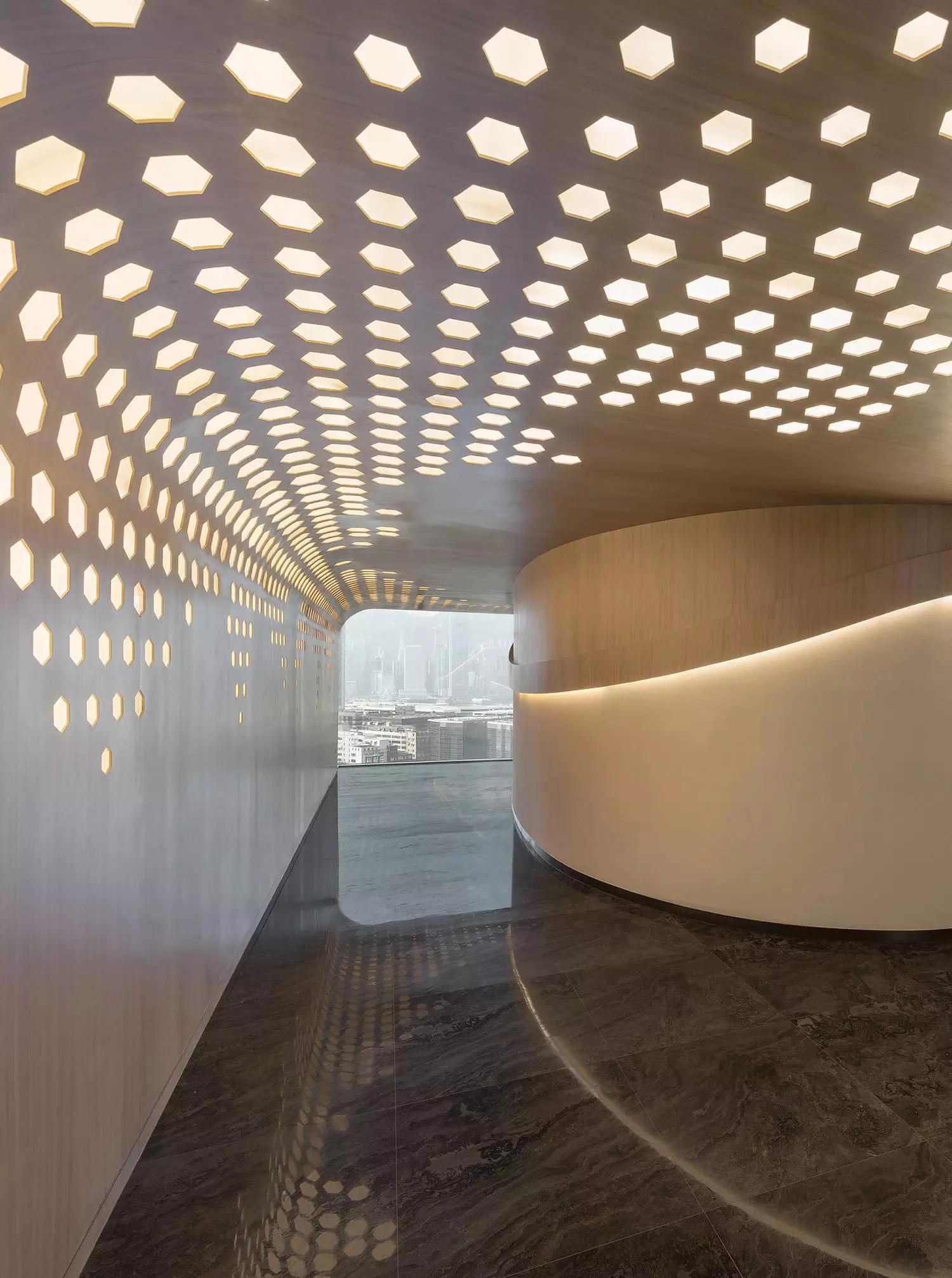 蜂窩形狀滲進天花至墻身的燈箱以及屏風,體現(xiàn)出大自然的親和力讓人心沈靜,宛若森林小徑,葉縫間穿過而灑落的陽光,體現(xiàn)日本韻文中的「Komorebi」靜謐而悠閑涵蘊希望。