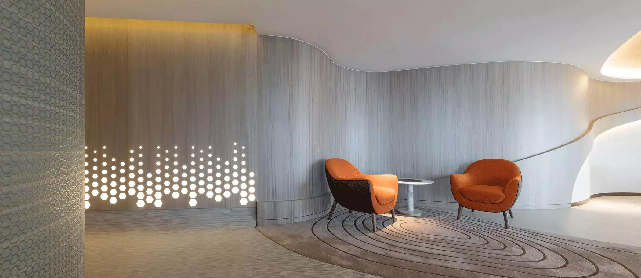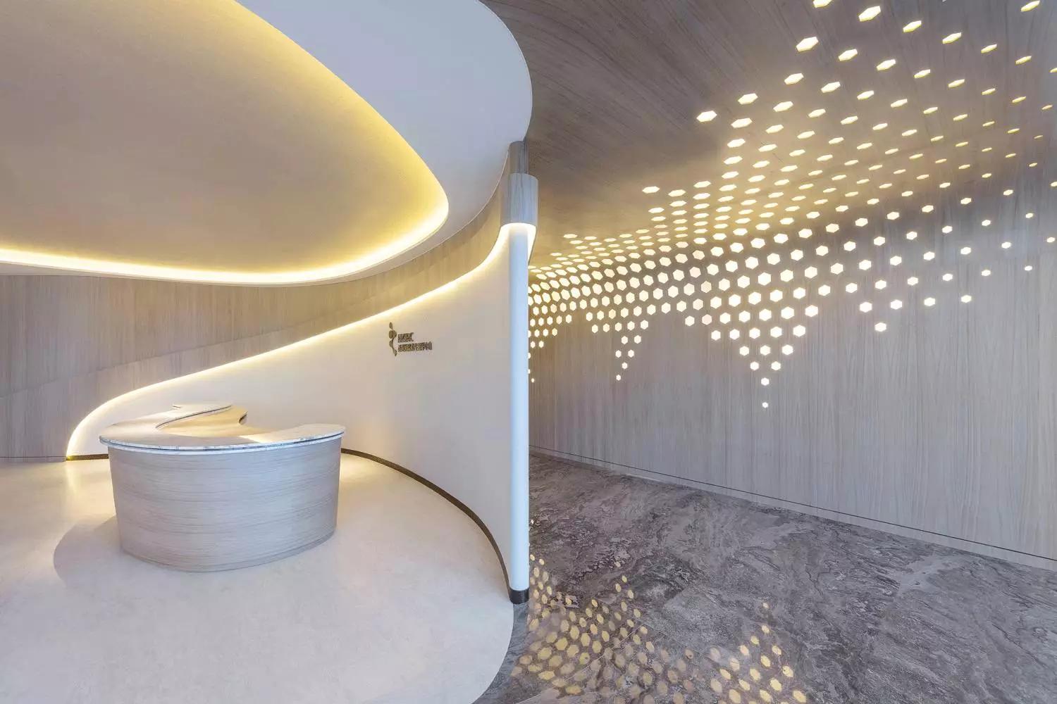 這一切該歸功于大自然的靈感,醫(yī)療中心的正門萃取最純?nèi)坏哪静?,配合溫暖的燈光分布,隨著流線形的空間引導訪客步進全開放的接待處。