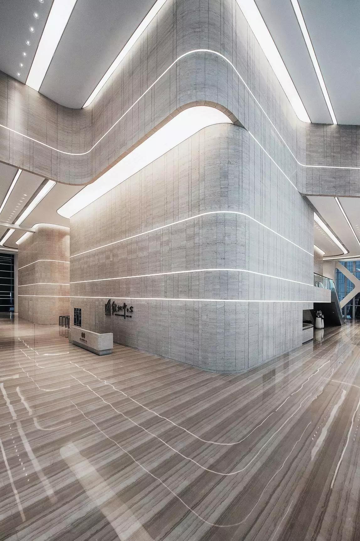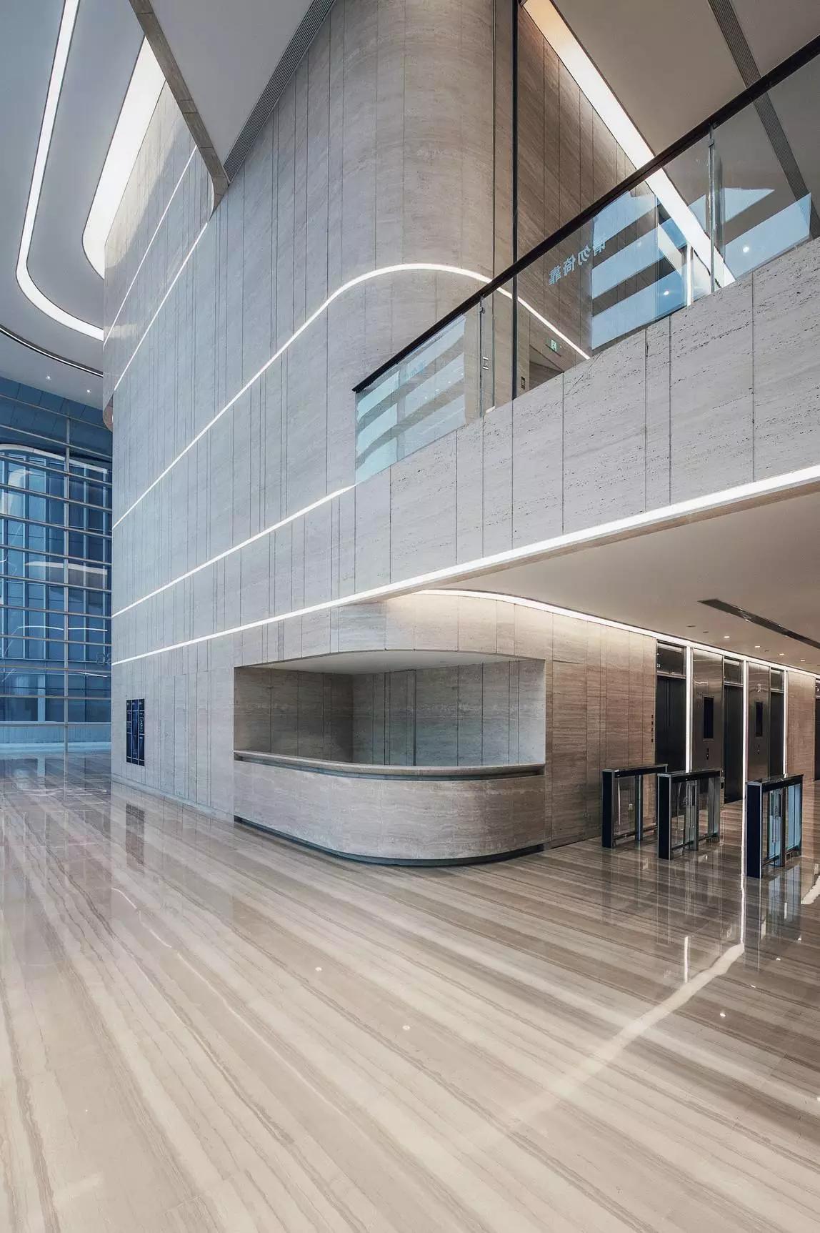 大堂設(shè)計將空間塑造作為首選,將形式、質(zhì)感、光與影等要素組合融入,創(chuàng)造性的表達空間的品質(zhì)和精神,放棄了多余的裝飾與造型,著重展現(xiàn)室內(nèi)空間與建筑空間的統(tǒng)一性。