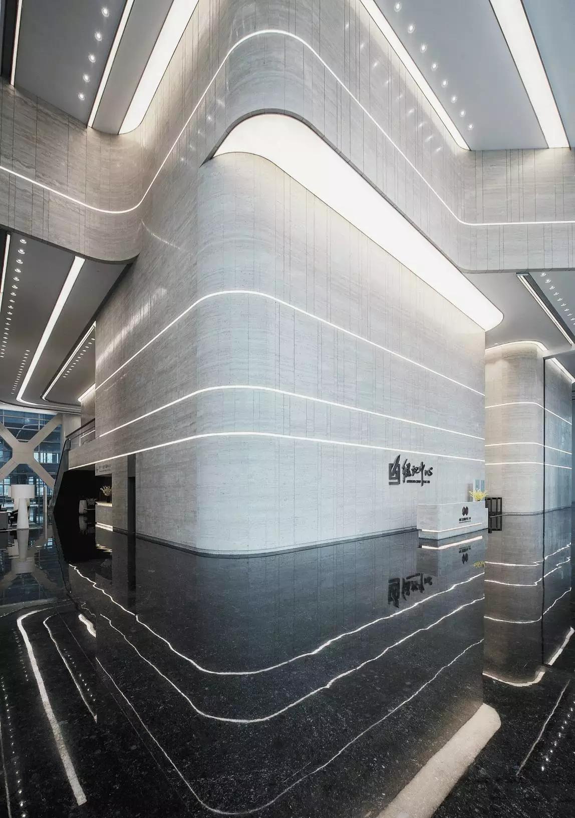 為了表達水的文化傳承,中原文化黑色為水,設(shè)計師選取安哥拉棕作為地面石材,給予空間穩(wěn)重大氣的基色,其反射天造型的倒影也成為地面裝飾的一部分。